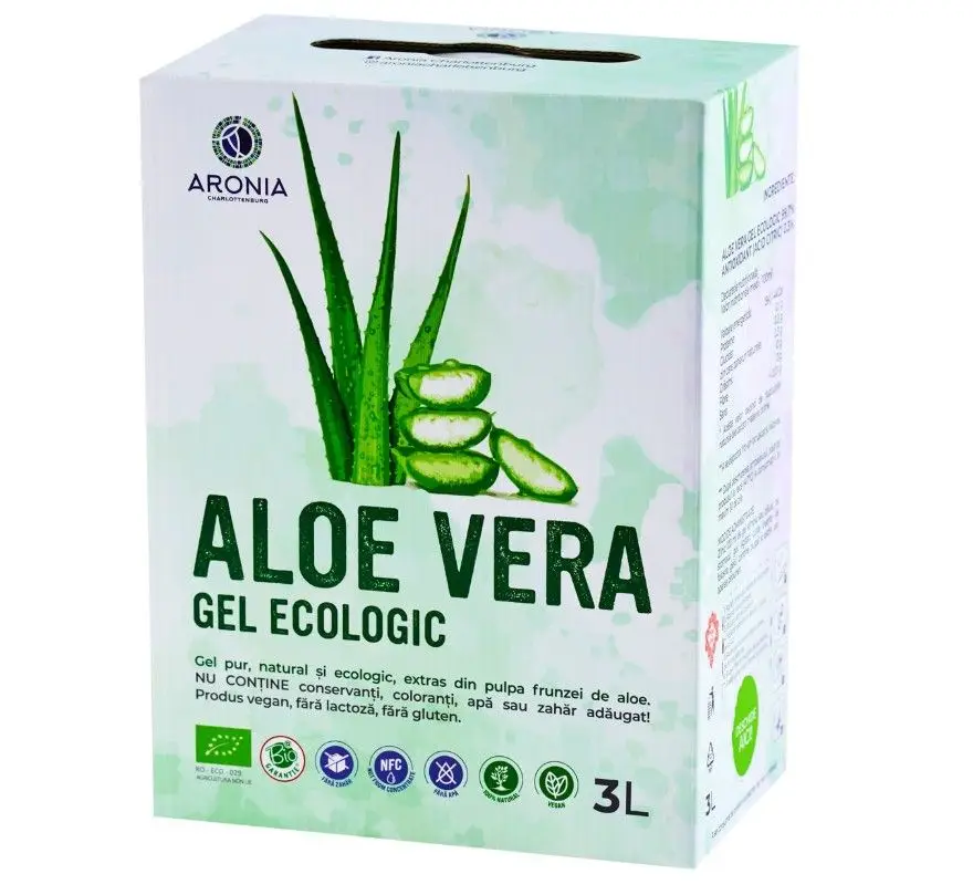 - Este un gel de Aloe Vera natural, vegan, certificat ecologic, 99,7% pulpă de Aloe Vera Barbadensis Miller, fără aloina, fără aditivi, fără zahăr adăugat, fără apă sau coloranţi.