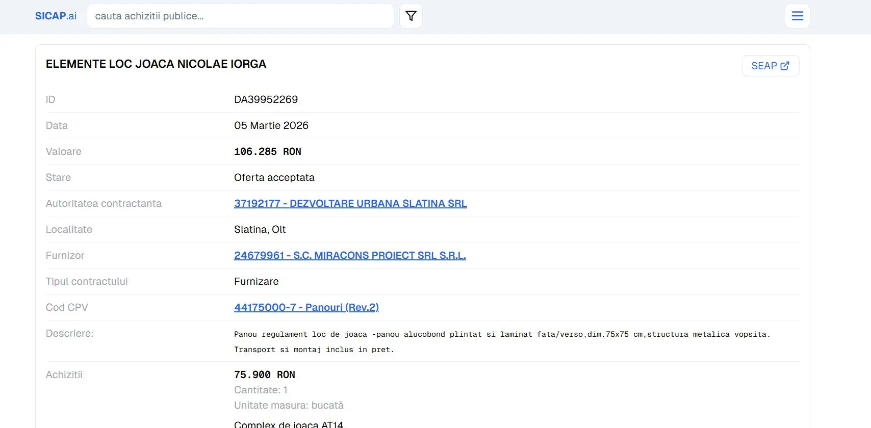 Societatea Dezvoltare Urbană Slatina SRL, entitate aflată sub autoritatea administrației locale, atrage atenția prin ritmul și volumul achizițiilor directe realizate în ultimul an. Cea mai recentă tranzacție, finalizată pe 5 martie 2026, vizează modernizarea locului de joacă de pe strada Nicolae Iorga, însă datele din sistemul public de achiziții scot la iveală o relație comercială privilegiată cu un singur furnizor.