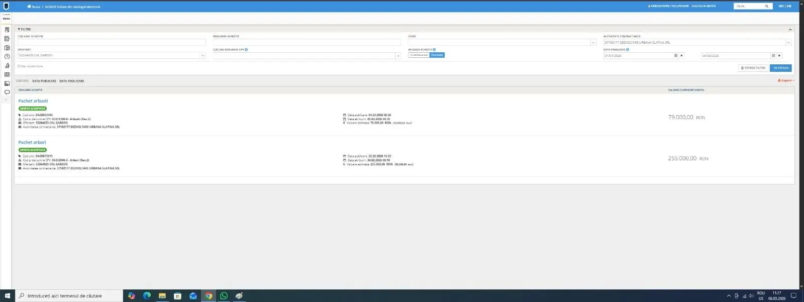 Prin această metodă, valoarea fiecărei achiziții a fost menținută sub pragul legal de aproximativ 270.120 lei, dar suma totală a depășit cu mult această barieră. Dacă adunăm pachetul de arbori de 255.000 lei, cel de arbuști de 79.000 lei și plantele ornamentale de 76.800 lei, rezultă un total de 410.800 lei fără TVA, cifră care ar fi impus, în mod normal, o procedură competitivă, nu o alegere directă „cu dedicație”.