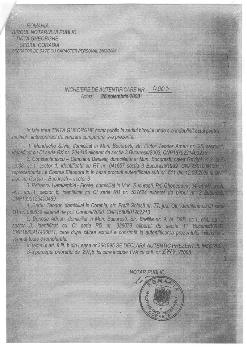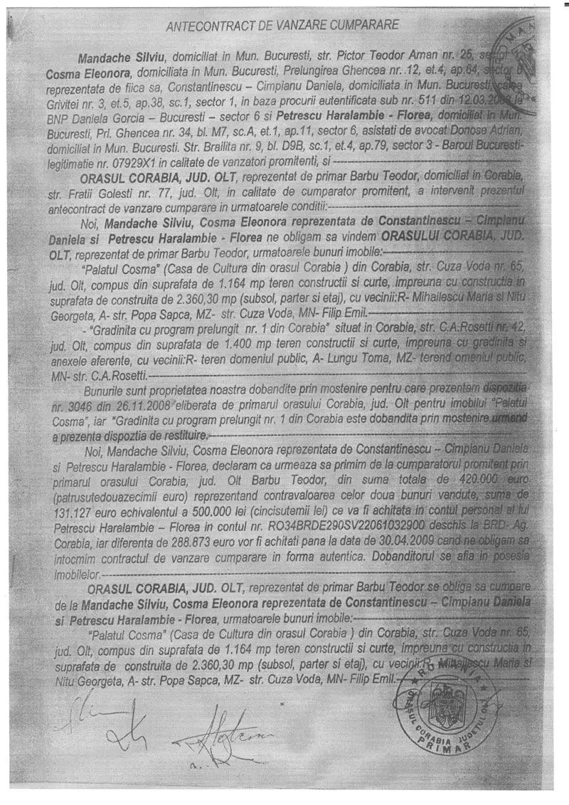 La Registratura Primăriei Corabia se află înscris un proces verbal numărul 10115 din 26 noiembrie 2008. Înregistrat la aceeaşi dată la care a fost şi încheiat. Documentul stipulează încheierea unui antecontract de vânzare-cumpărare, autentificat prin birou notarial, ce reprezintă cel mai mare tun dat vreodată de un primar corăbienilor şi patrimoniului oraşului. O speţă penală pe care Poliţia Corabia o trece cu vederea. În fapt, antecontractul de vânzare-cumpărare încheiat între Teodor Barbu-reprezentant al oraşului Corabia, în calitate de primar şi bucureştenii Silviu Mandache şi Cosma Eleonora, reprezentaţi la rândul lor prin alte două persoane, stipulează, negru pe alb, obligaţia celor doi bucureşteni de a vinde oraşului Corabia următoarele imobile: 1. Palatul Cosma, de fapt Casa de Cultură Corabia, compus din 1.164 mp de teren, construcţii şi curte plus o construcţie în suprafaţă de 2.360,30 mp, subsol, parter şi etaj. 2.Grădiniţa cu Program Prelungit nr.1 Corabia, compusă din suprafaţa de 1.400 mp teren, construcţii, curte şi anexele aferente. Bunurile reprezintă proprietatea lui Silviu Mandache şi a Eleonorei Cosma, dobândite prin moştenire. Pentru acestea, primarul Barbu a emis în aceeaşi zi în care a fost încheiat precontractul de vânzare-cumpărare, 26.11.2008, o dispoziţie de restituire a lor. O dispoziţie în nume propriu care poartă o singură semnătură: Teodor Barbu, primar al oraşului Corabia. Primăria urma să achiziţioneze cele două imobile, de la cei doi moştenitori, la preţul negociat de Barbu cu aceştia: 420 mii de euro. Tot primăria, prin reprezentantul ei legal, primarul Barbu, se obliga să achite un avans de 131.127 Euro, echivalentul a 6 miliarde lei, la acea dată. Diferenţa de 288.873 Euro urma să fie achitată celor doi corăbieni la data de 30.04.2009. Dată solicitată de însuşi domnul primar?! De altfel, 30.04.2009 reprezentând şi momentul încheierii contractului de vânzare-cumpărare, în formă autentică. Condiţiile solicitate de Barbu demonstrează că primarul îşi făcuse, cel puţin teoretic, nişte socoteli. Că existau banii necesari achitării celor două imobile şi că localnicii, amărâţi şi şomeri cum erau ei, îşi achitau conştiincioşi impozitele şi taxele locale. Pe ce altceva să fi mizat Barbu?! Numai că…
