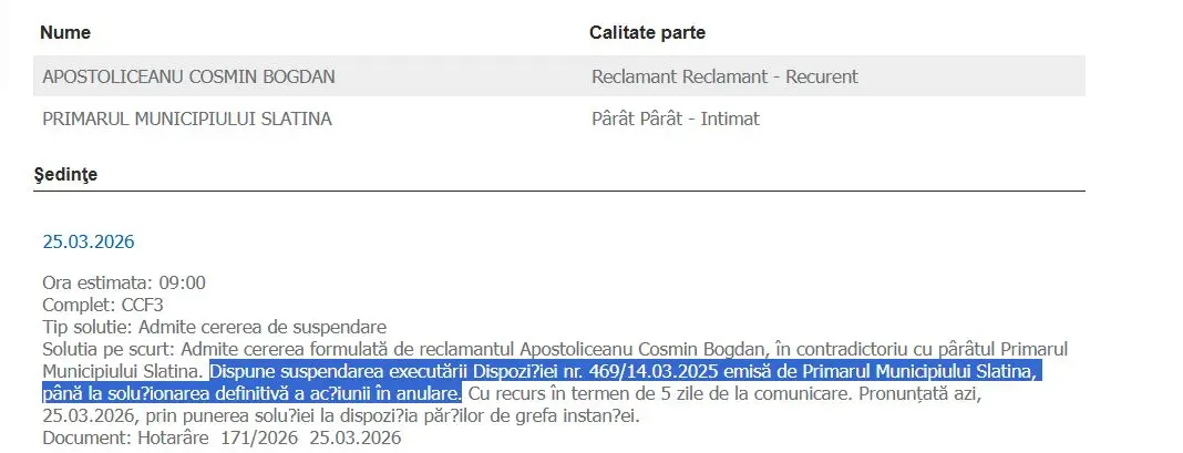 Solutia pe scurt: Admite cererea formulată de reclamantul Apostoliceanu Cosmin Bogdan, în contradictoriu cu pârâtul Primarul Municipiului Slatina. Dispune suspendarea executării Dispoziţiei nr. 469/14.03.2025 emisă de Primarul Municipiului Slatina, până la soluţionarea definitivă a acţiunii în anulare. Cu recurs în termen de 5 zile de la comunicare. Pronunţată azi, 25.03.2026, prin punerea soluţiei la dispoziţia părţilor de grefa instanţei.