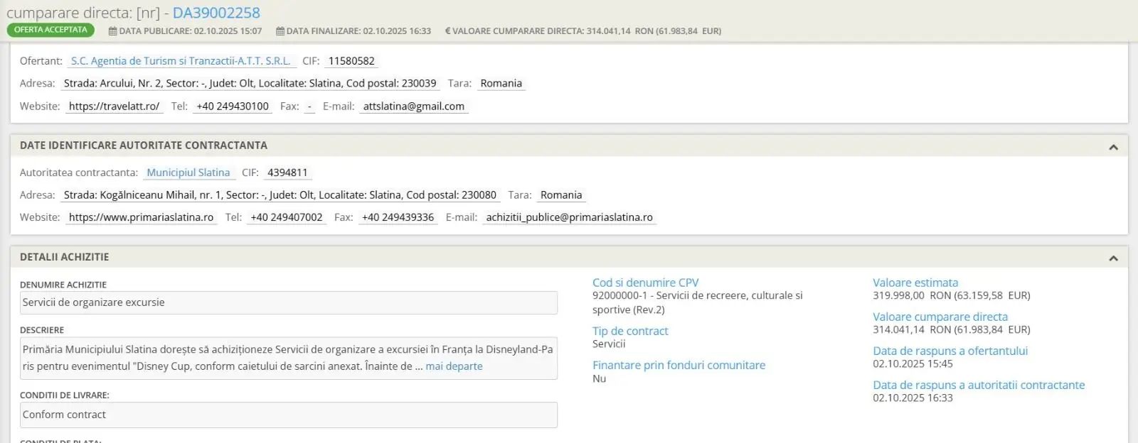 Reamintim că CNSC - Consiliul Național de Soluționare a Contestațiilor - a admis contestația depusă de o firmă din Craiova în legătură cu licitația organizată de Primăria Slatina pentru excursia elevilor câștigători ai competiției Disney Cup. Decizia confirmă nereguli în procedura derulată de administrația condusă de primarul Mario De Mezzo, care ar fi favorizat o firmă apropiată.