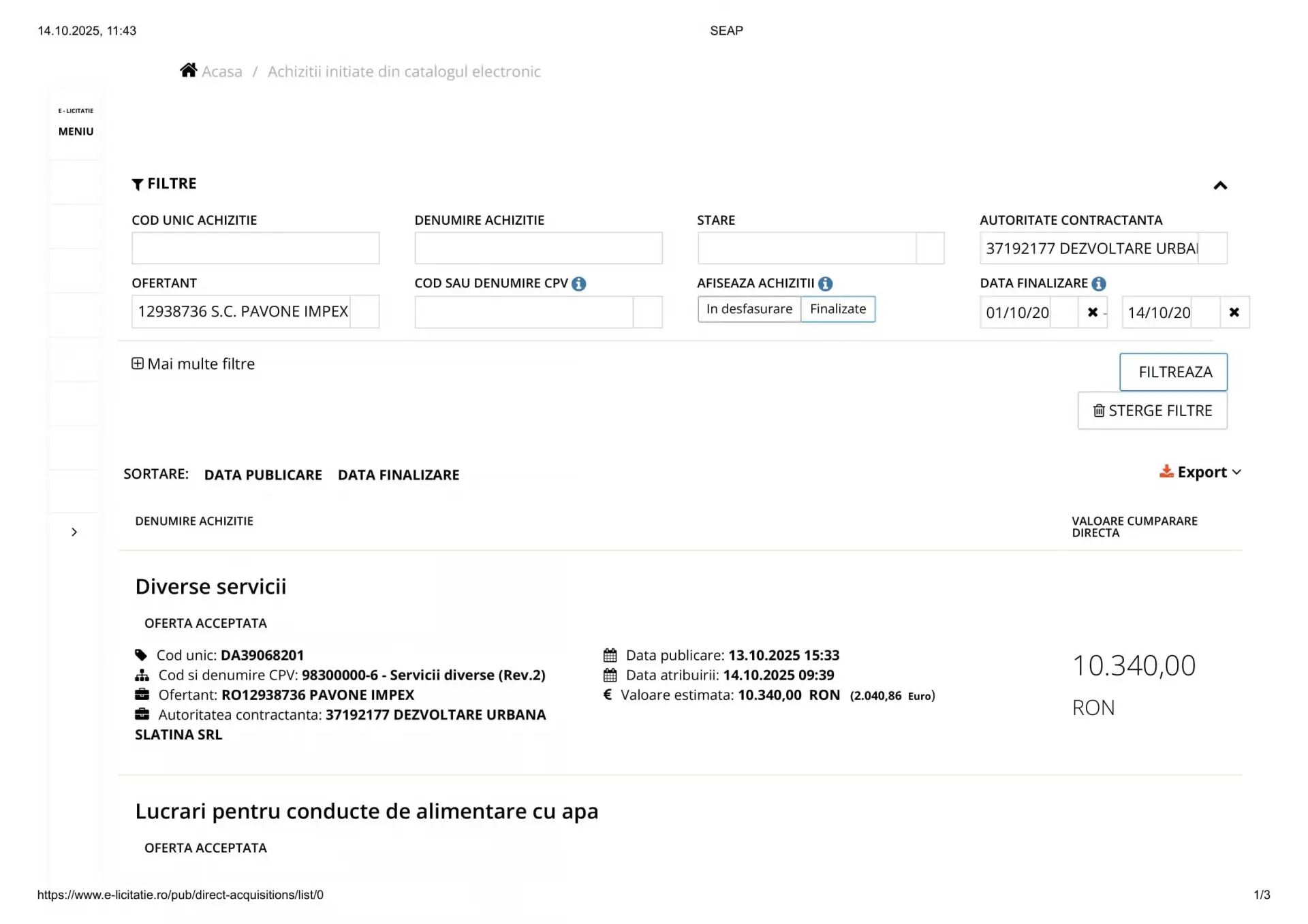 - Diverse servicii, valoare - 2.040,86 euro, data atribuirii - 14 octombrie 2025