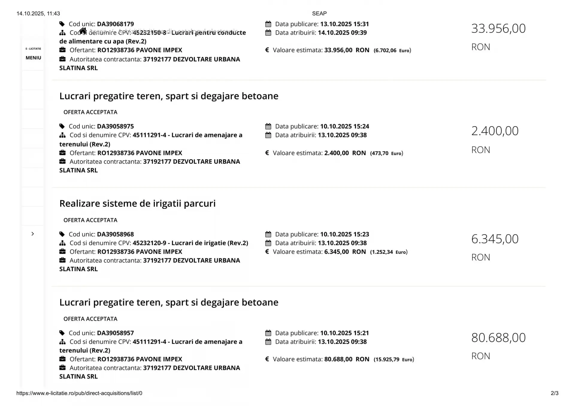 - Realizare sisteme de irigaţii parcuri, valoare - 42.103,80 euro, data atribuirii - 13 octombrie 2025