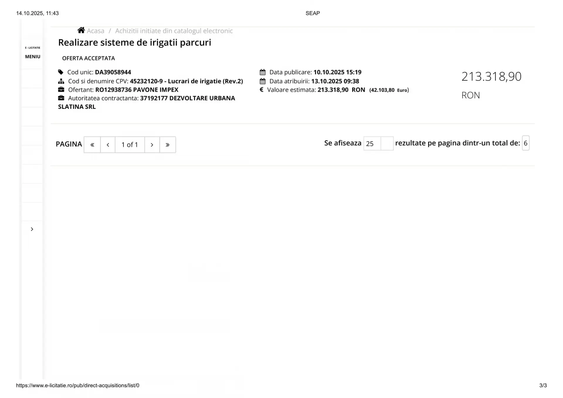 - Realizare sisteme de irigaţii parcuri, valoare - 1.252,34 euro, data atribuirii - 13 octombrie 2025