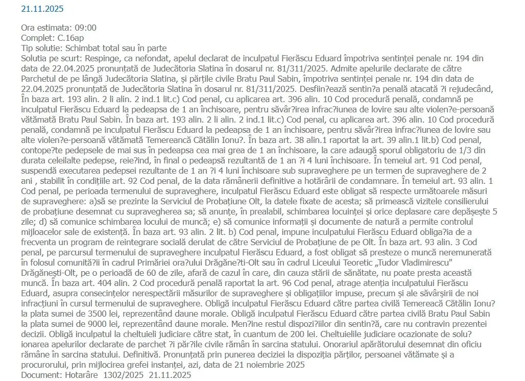 Curtea de Apel Craiova a decis schimbarea sentinţei iniţiale a Judecătoriei Slatina, care îl condamnase doar la plata unei amenzi penale.