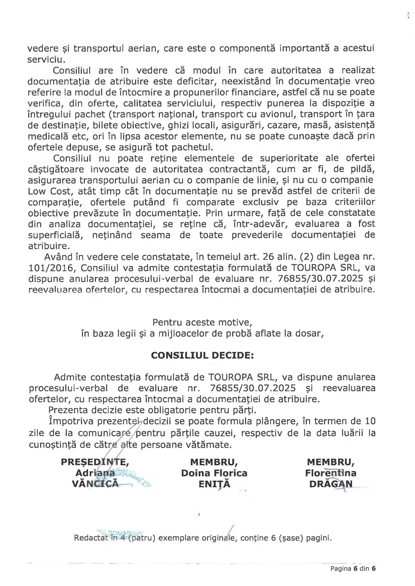 TOUROPA SRL, o firmă din Craiova, a contestat rezultatul procedurii prin care a fost declarată câștigătoare Agenția de Turism și Tranzacții ATT SRL, solicitând anularea procedurii de atribuire.