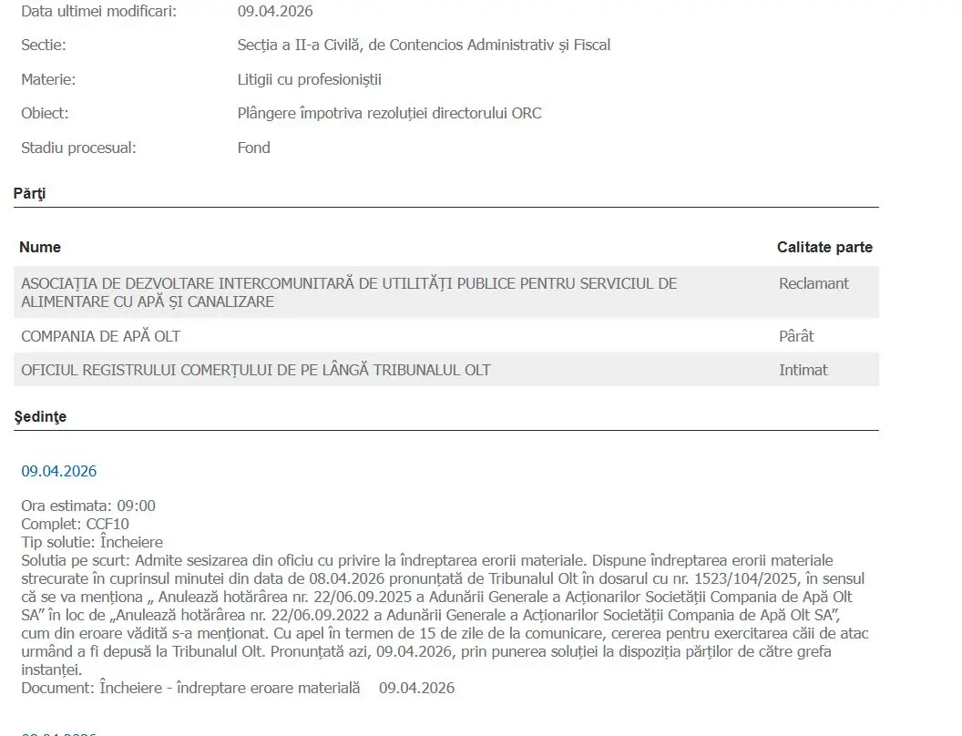 Asociaţia de Dezvoltare Intercomunitară (ADI) de Utilități Publice pentru Serviciul de Alimentare cu Apă şi Canalizare a certu în instanţă anularea hotărârii nr. 22/06.09.2022 a Adunării Generale a Acţionarilor Societăţii Compania de Apă Olt SA prin care s-au prelungit mandatele membrilor din Consiliul de Administraţie.