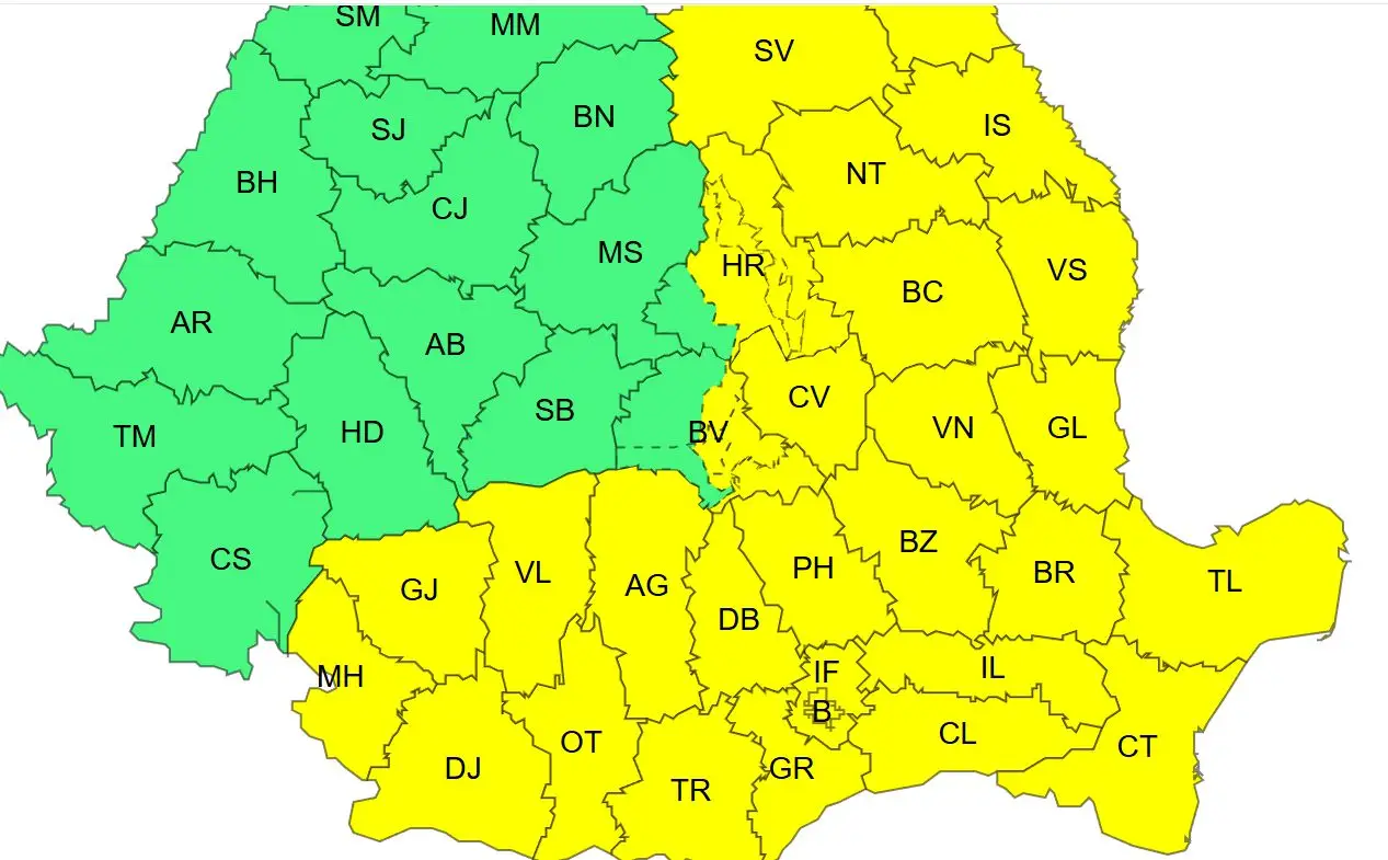 Până marţi, 3 februarie, ora 10.00, este în vigoare un Cod Galben de ger. Potrivit ANM, în Moldova, Dobrogea, Oltenia, Muntenia, estul și sud-estul Transilvaniei, vor fi temperaturi deosebit de scăzute (în medie, cu 7...9 grade mai mici decât cele normale datei) cu valori maxime ce se vor încadra între -9 și -3 grade, mai mici în nordul Moldovei, până spre -15 grade, unde gerul va persista și pe parcursul zilei. Noaptea va fi ger, astfel că temperaturile minime se vor încadra între -20 și -8 grade.