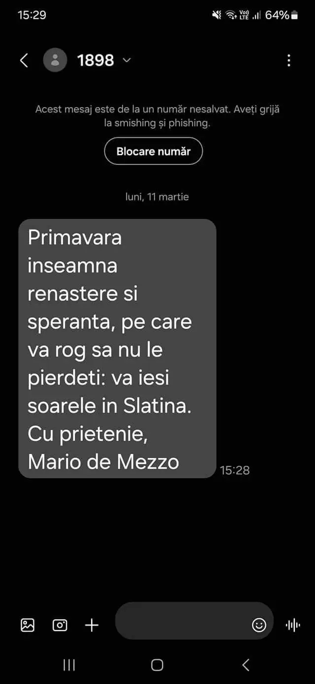 - Prefectul de Olt a început deja să folosească datele de contact strânse de la slătineni pentru aşa-zisul referendum privind acordarea de apă gratuită, iar pe 8 martie mai multe persoane au primit mesaje de felicitare de la candidatul PNL la Primăria Slatina.