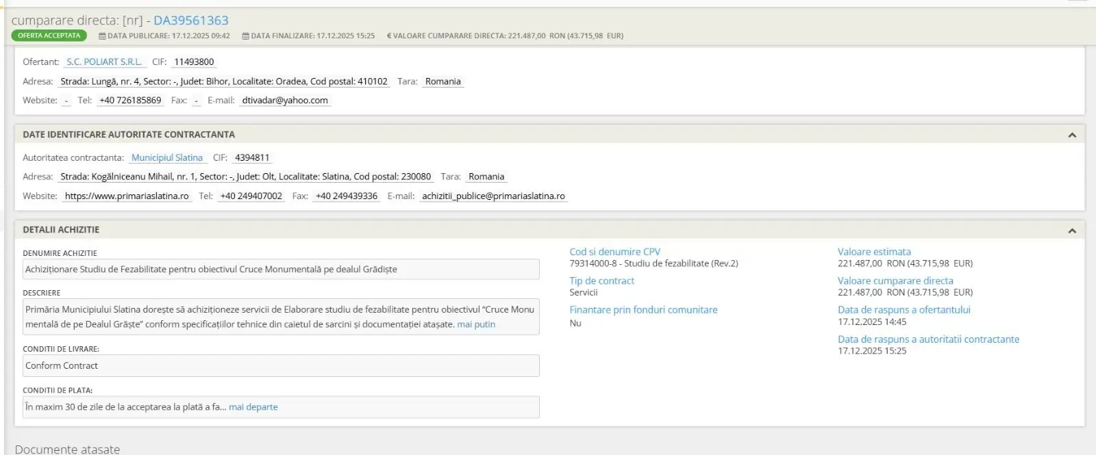 Potrivit datelor SICAP, contractul a fost dat prin atribuire directă - cum altfel? - firmei Poliart SRL din Oradea, care primeşte de la Primăria Slatina 221.487 lei, adică 43.715,98 euro.