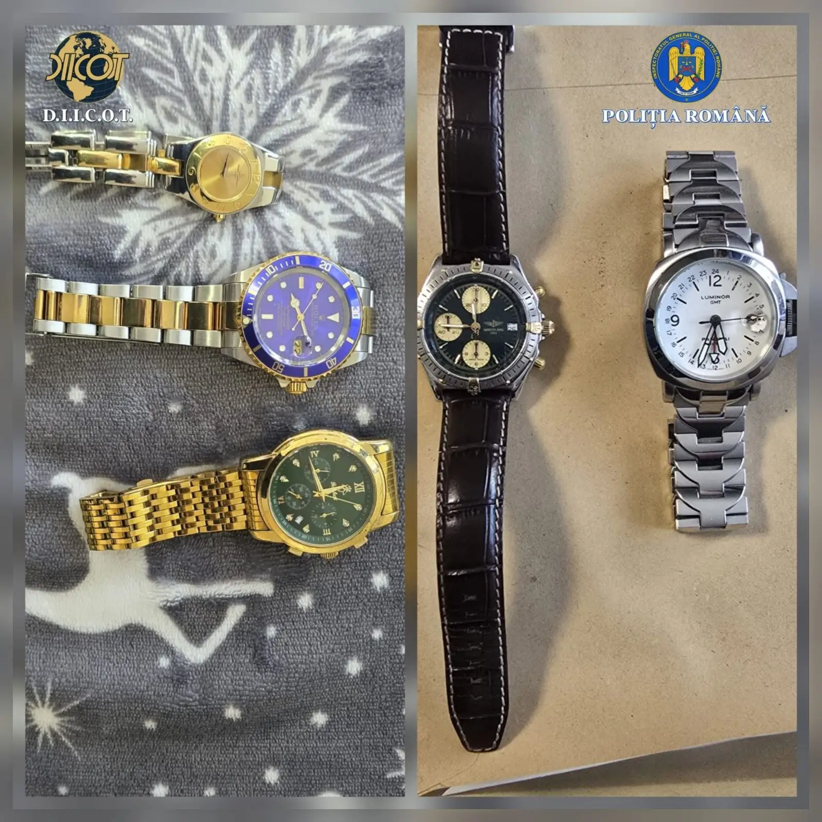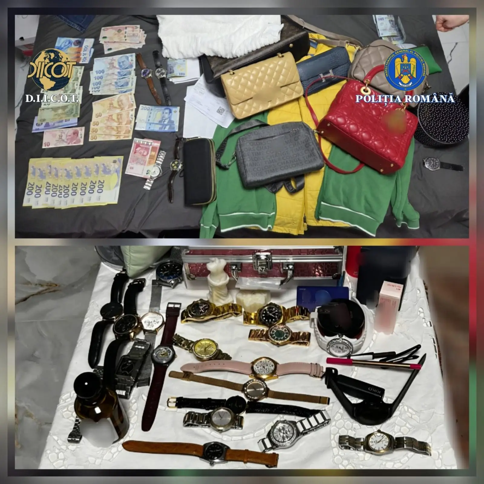 În urma perchezițiilor efectuate au fost identificate și ridicate bijuterii (inele, brățări, coliere) și ceasuri de lux, o parte dintre acestea fiind inscripționate cu numele unora dintre persoanelor vătămate, monede, obiecte de vestimentație, genți, sumele de 71.000 euro, 12.000 USD, 300 franci elvețieni, dispozitive de stocare a datelor, două pistoale cu gaze iritant-lacrimogene, 74 cartușe cu gaz, un pistol cu capse, un pistol și 55 de cartușe, deținute ilegal, arme albe, precum și alte mijloace de probă, ce urmează să fie puse la dispoziția autorităților judiciare germane.