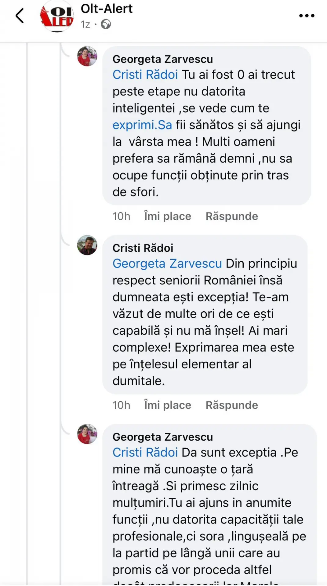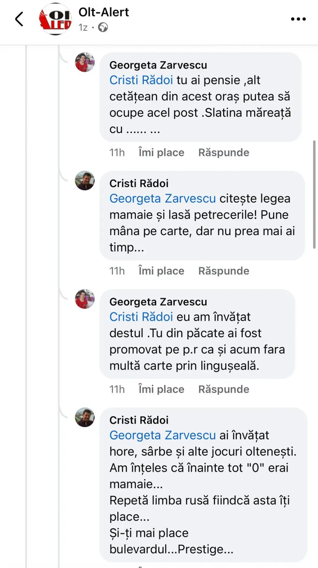 Nemulţumit de faptul că Georgeta Zarvescu, o pensionară din Slatina, comentează pe Facebook la un articol despre faptul că şeful Poliţiei Locale Cristinel Rădoi încasează bani din două locuri de la stat, acesta a avut o ieşire suburbană, la adresa acesteia.