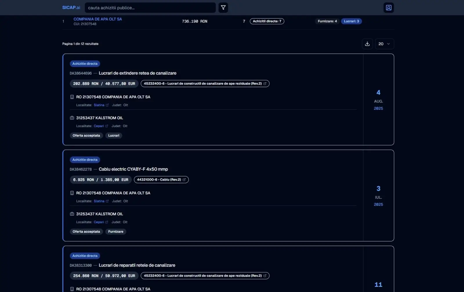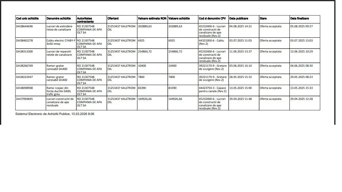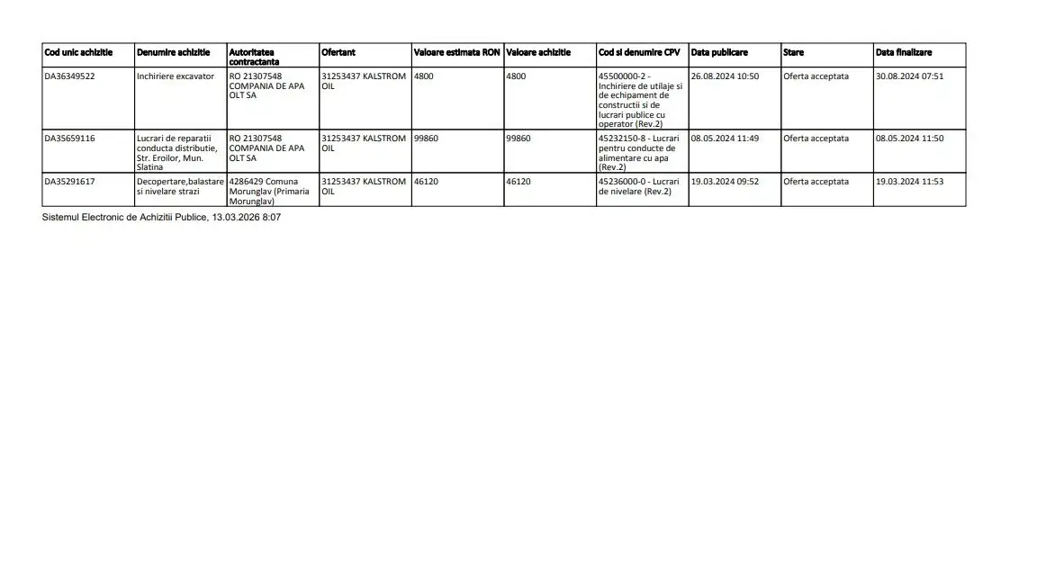 O analiză asupra firmelor care primesc aceste contracte scoate la iveală o schemă de „firme-oglindă” controlate de familia Călărașu. Kalstrom Oil SRL, firmă controlată de Călărașu Gheorghe-Cătălin și Călărașu Virgil Mihai, a raportat în 2024 o explozie a profitului de 1059%, devenind principalul beneficiar al achizițiilor directe de la Compania de Apă Olt.