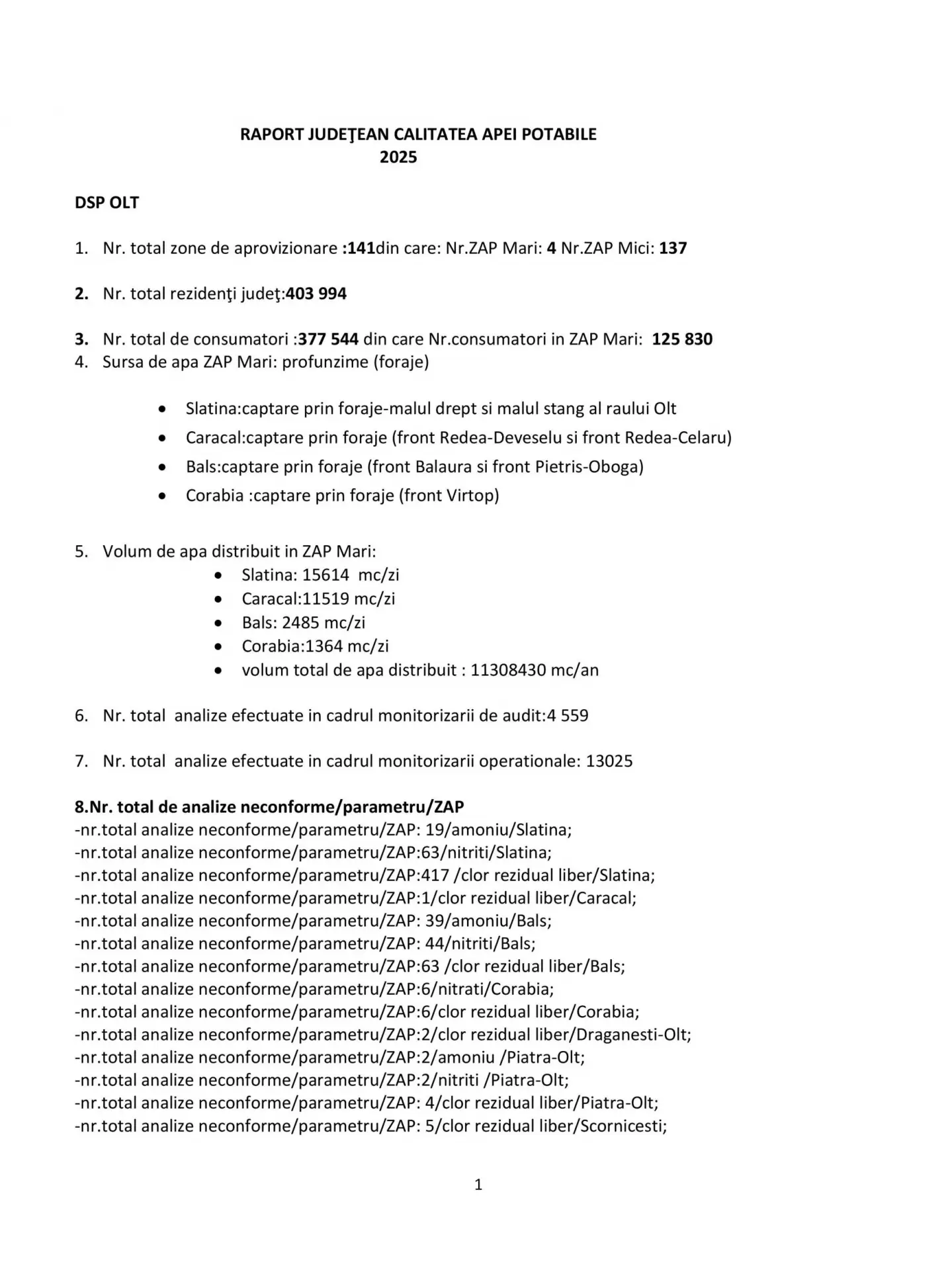 RAPORT CALITATE APA POTABILA JUDETUL OLT 2025: