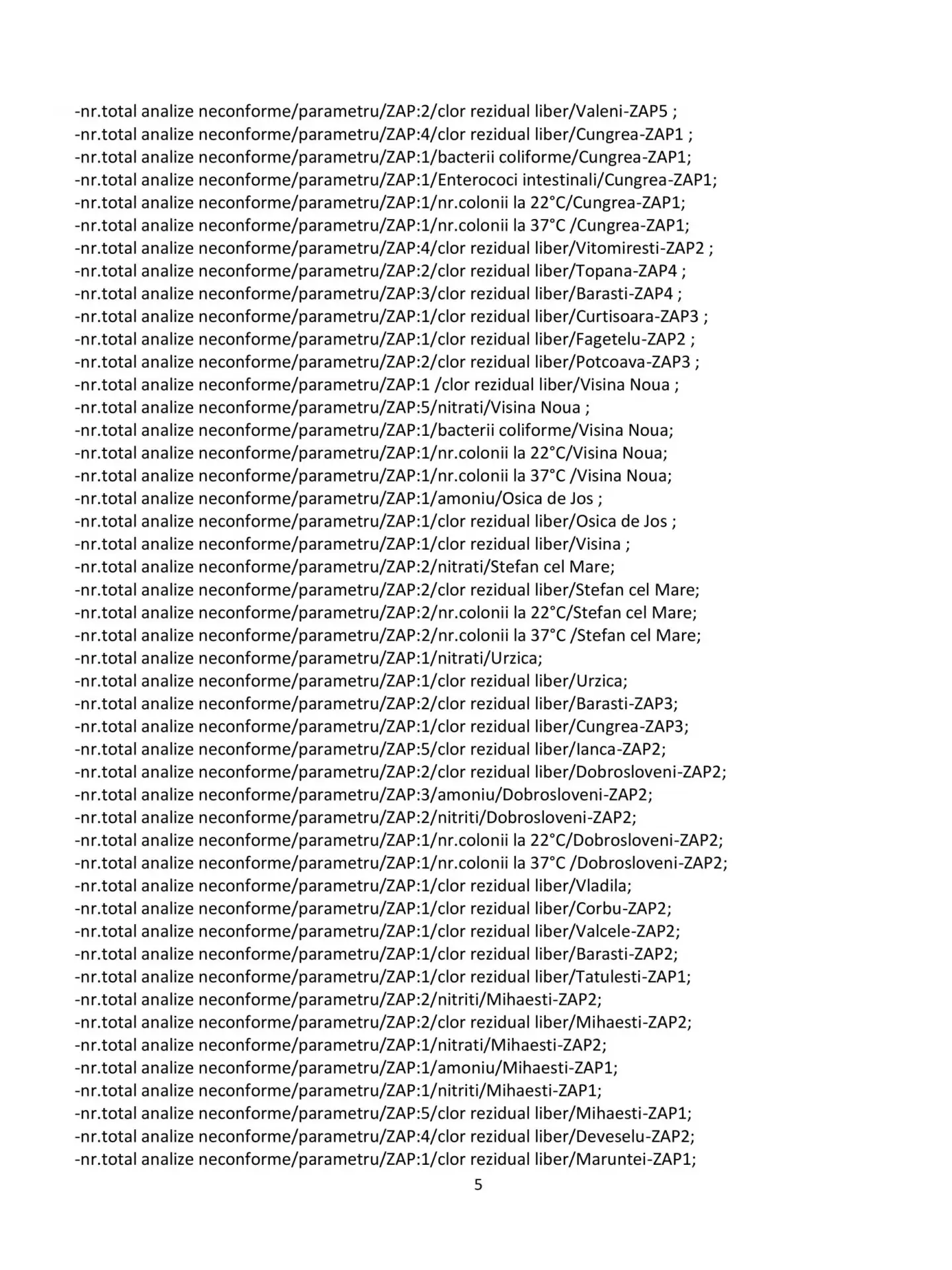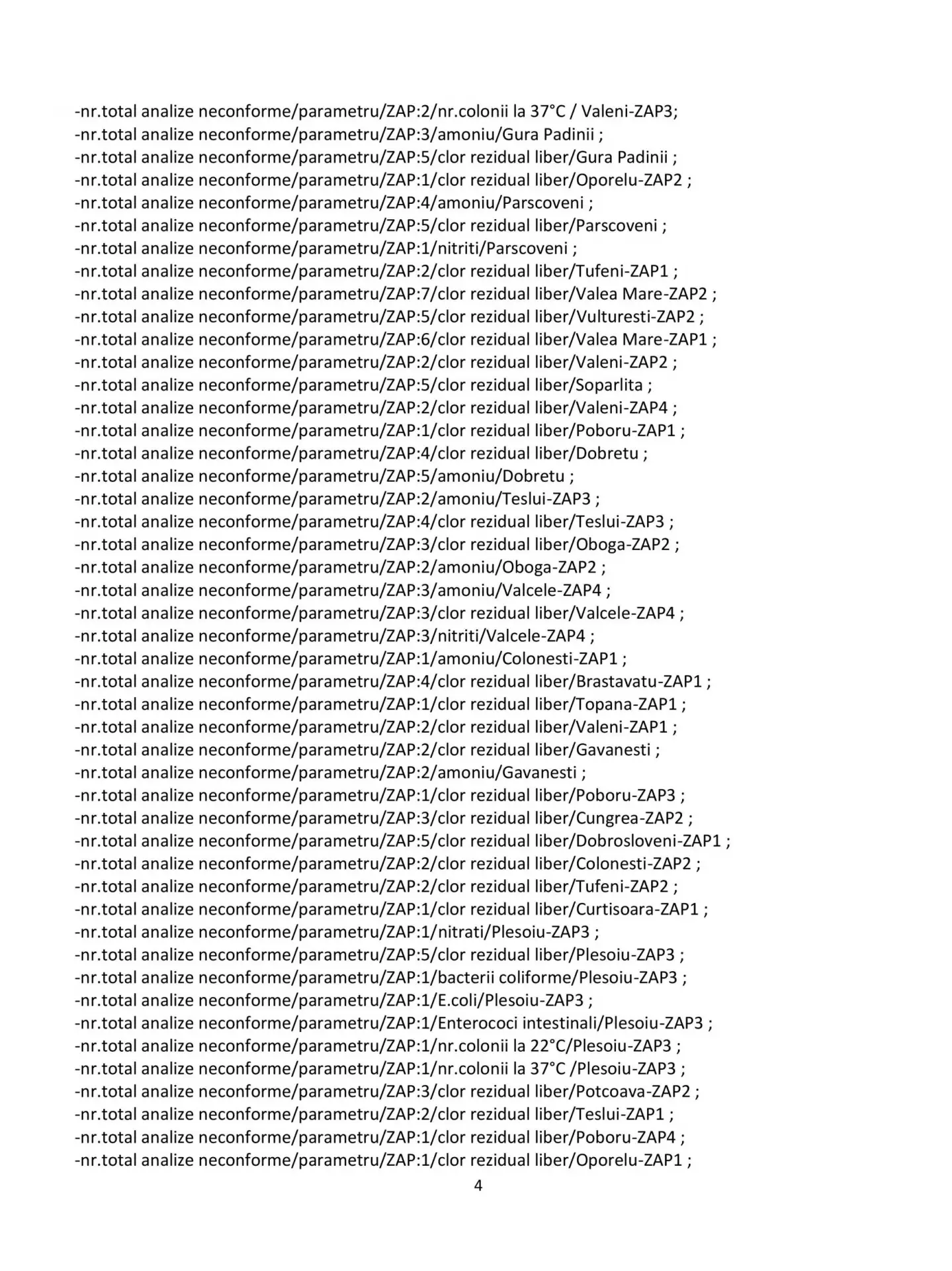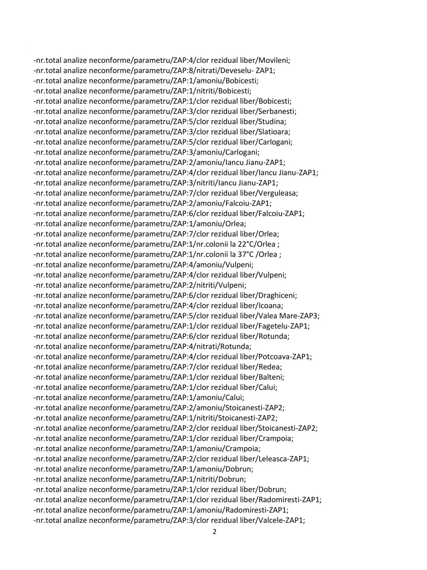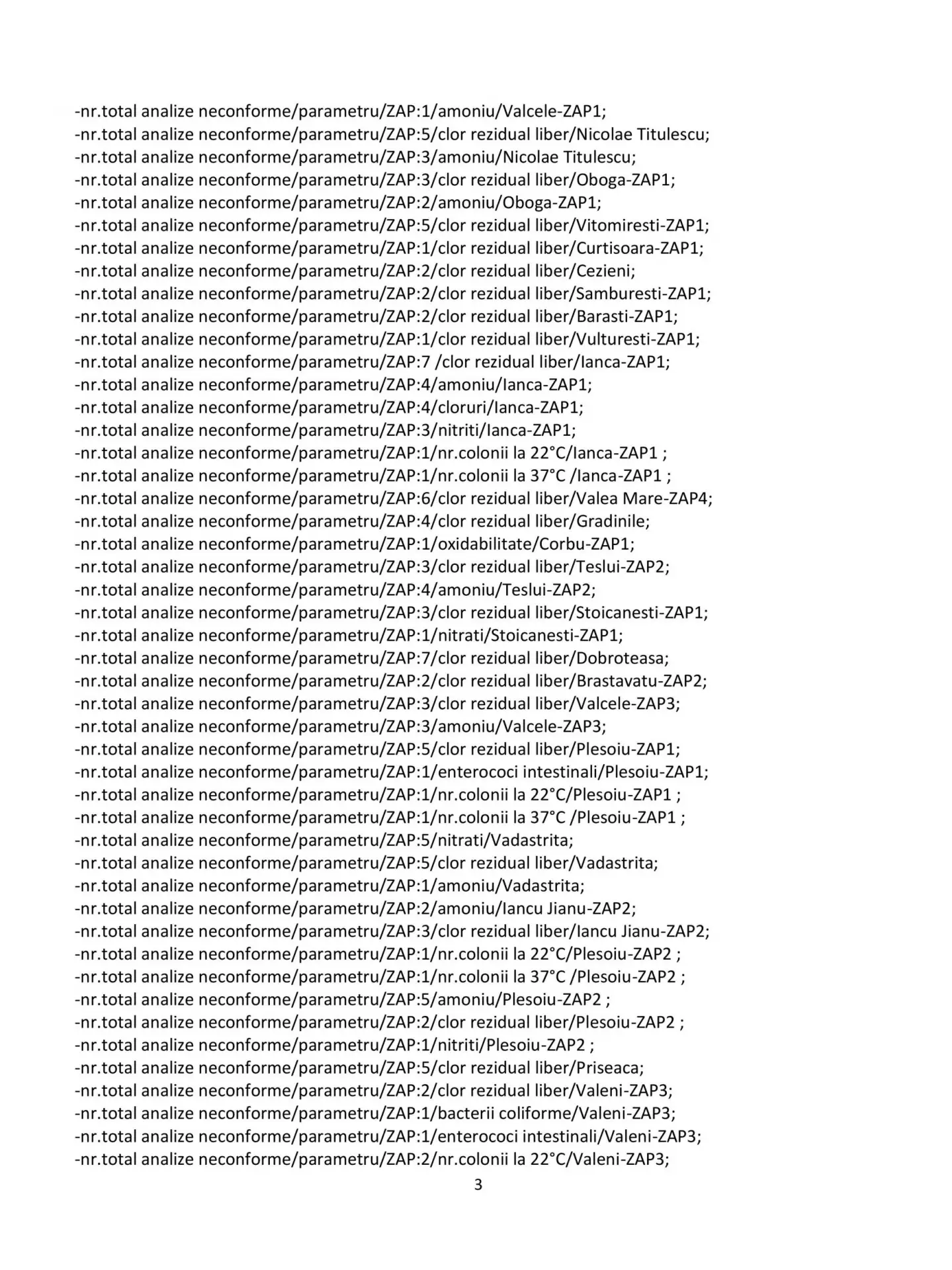 „-nr.total analize neconforme/parametru/ZAP: 19/amoniu/Slatina; -nr.total analize neconforme/parametru/ZAP:63/nitriti/Slatina; -nr.total analize neconforme/parametru/ZAP:417 /clor rezidual liber/Slatina”, se precizează în documentul oficial.