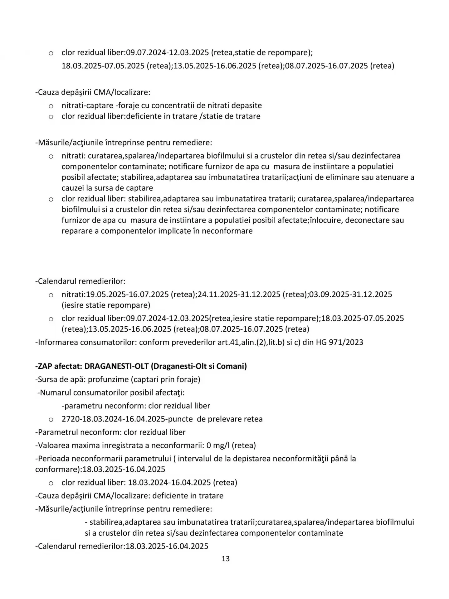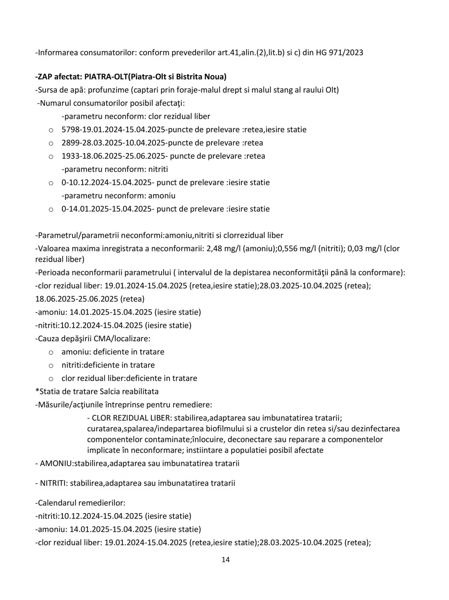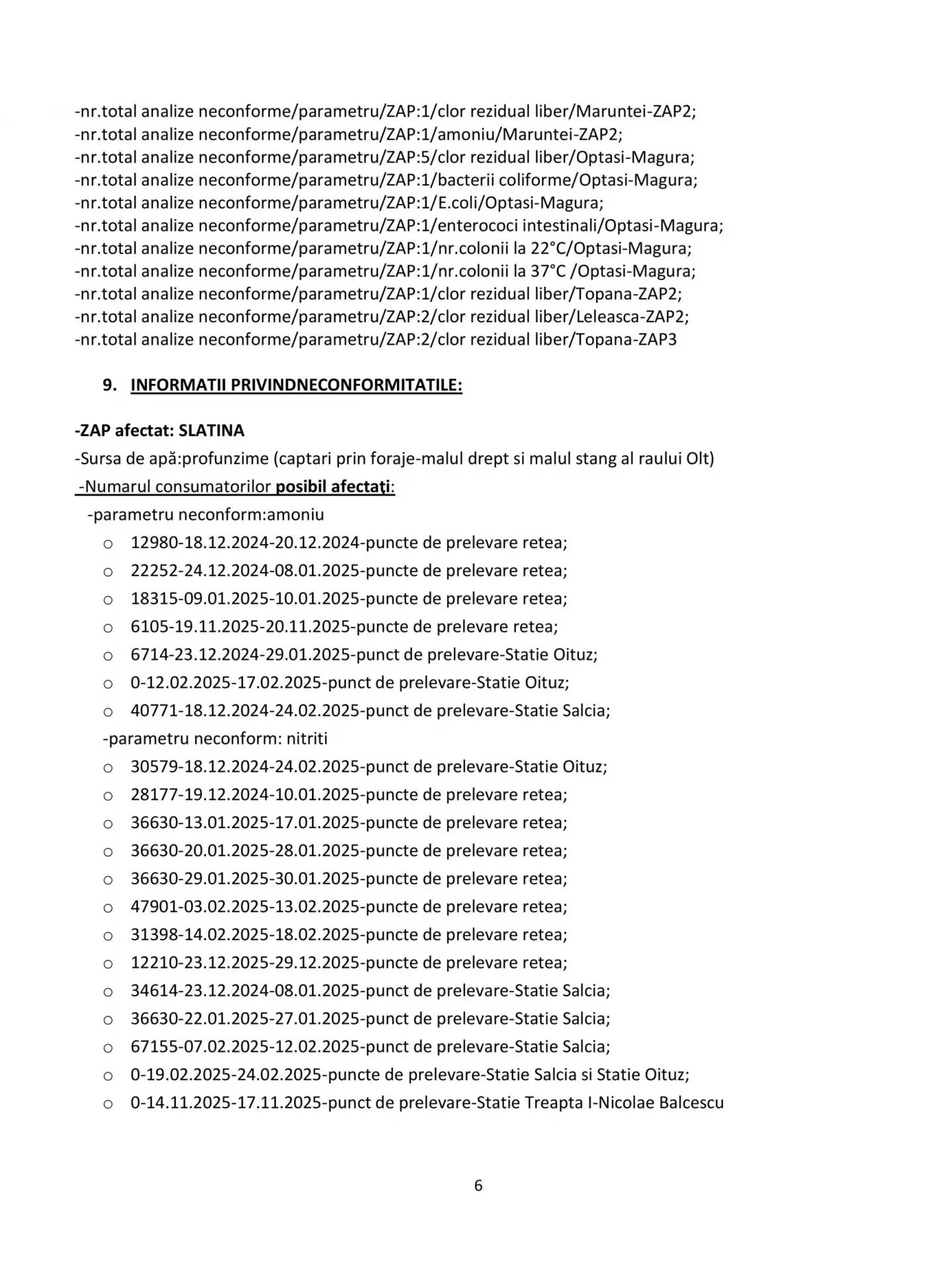 „-nr.total analize neconforme/parametru/ZAP: 19/amoniu/Slatina; -nr.total analize neconforme/parametru/ZAP:63/nitriti/Slatina; -nr.total analize neconforme/parametru/ZAP:417 /clor rezidual liber/Slatina”, se precizează în documentul oficial.