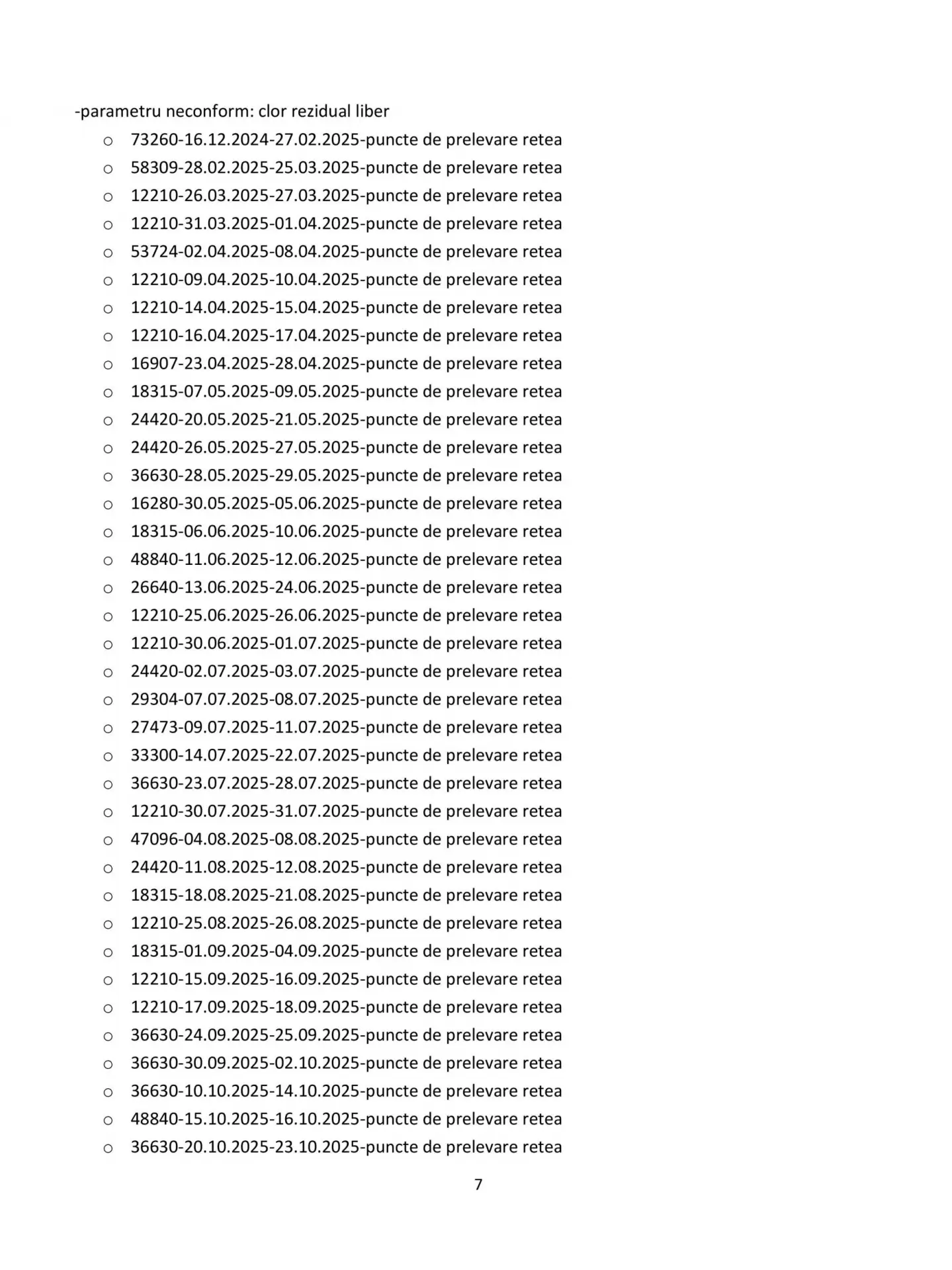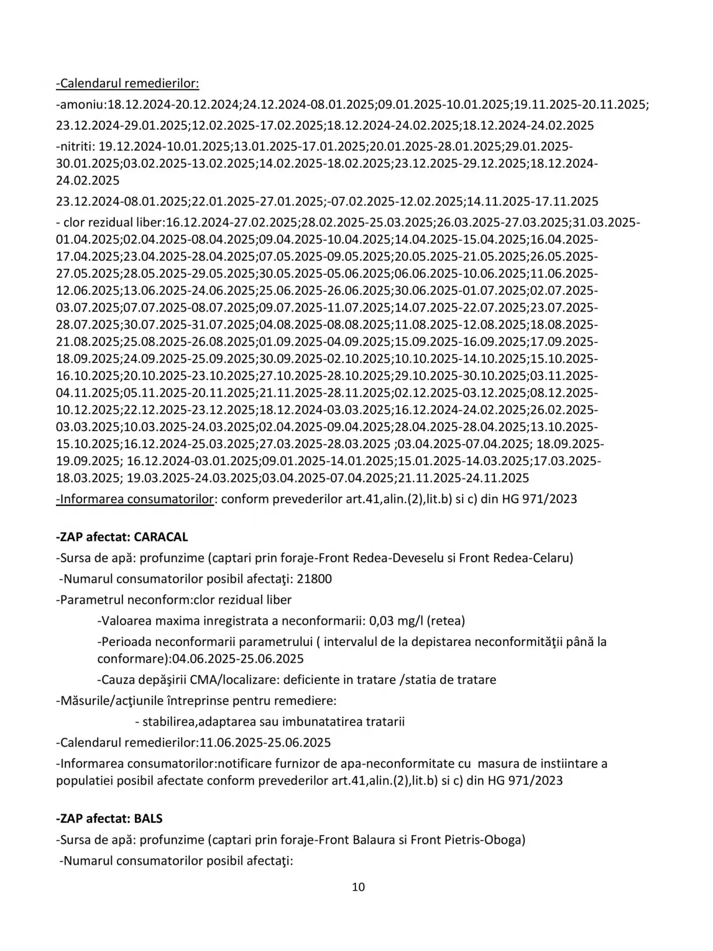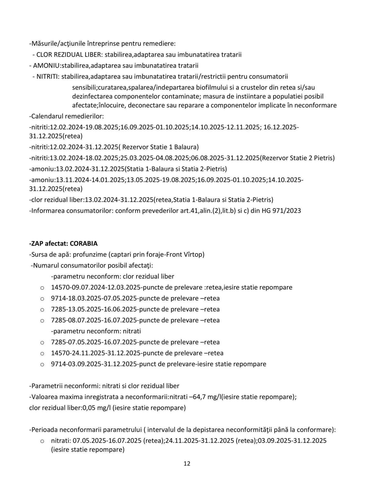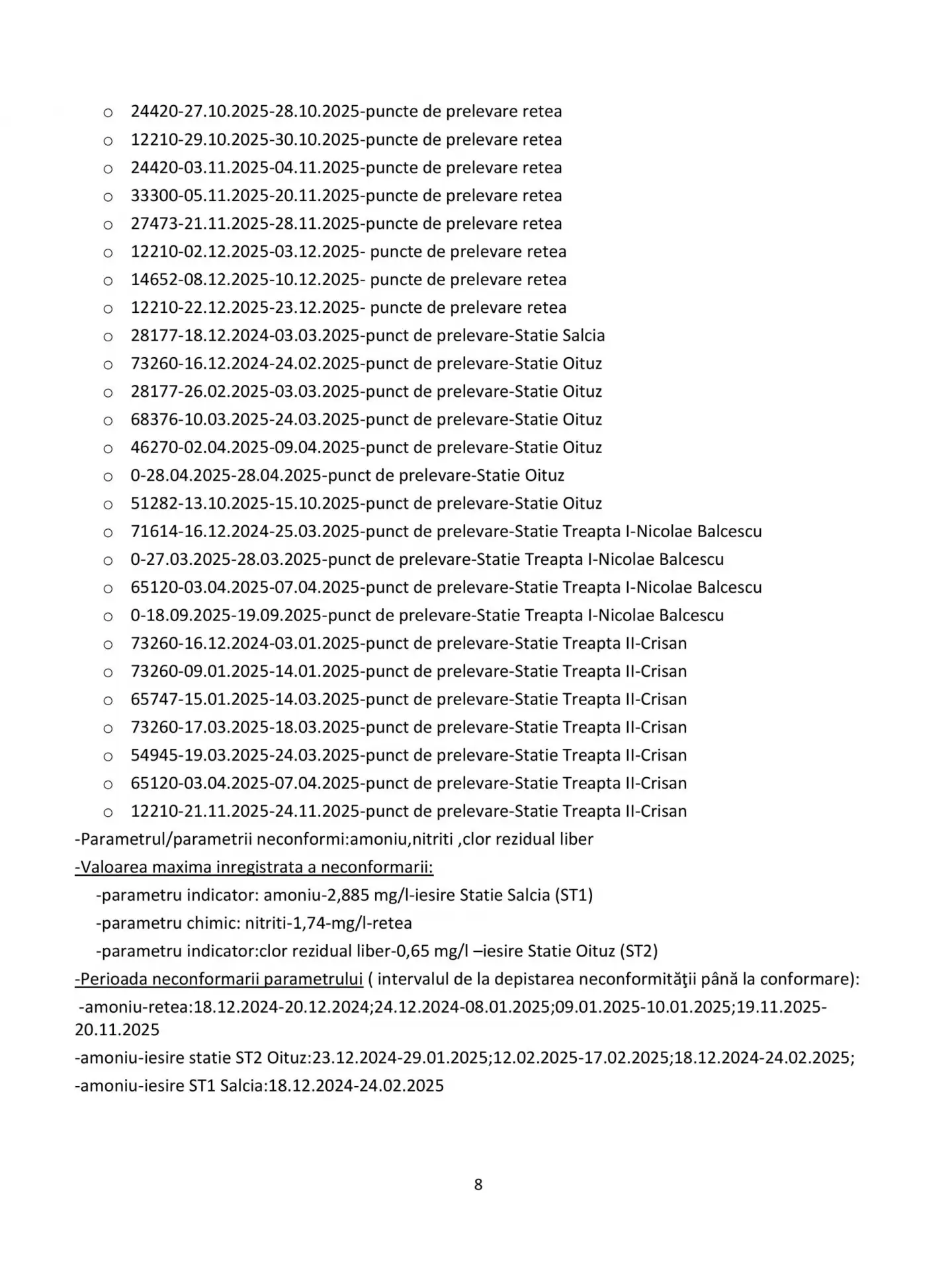 „-nr.total analize neconforme/parametru/ZAP: 19/amoniu/Slatina; -nr.total analize neconforme/parametru/ZAP:63/nitriti/Slatina; -nr.total analize neconforme/parametru/ZAP:417 /clor rezidual liber/Slatina”, se precizează în documentul oficial.