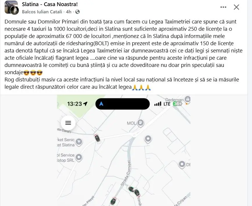 Iulian Catali Balcos, taximetrist din Slatina, a publicat pe Facebook o postare prin care acuză autorităţile locale că încalcă prevederile Legii Taximetriei, permiţând funcţionarea unui număr prea mare de maşini înregistrate prin aplicaţia Bolt.