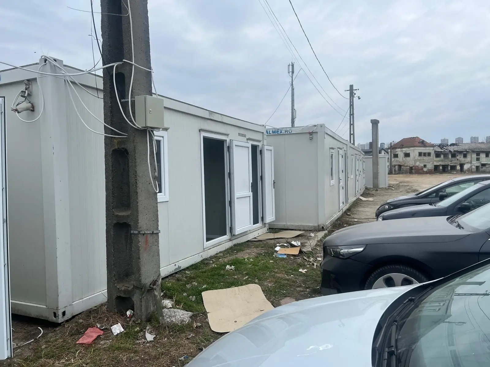 Mai mult, mizeria este prezentă la fiecare pas. Fotografiile arată mormane de gunoaie menajere, PET-uri, cartoane și anvelope abandonate chiar lângă pereții containerelor. Lipsa pubelelor și a unui sistem de colectare a deșeurilor a transformat perimetrul într-o zonă insalubră. Această stare de fapt atrage haite de câini fără stăpân, care caută hrană printre resturi, punând în pericol siguranța celor evacuați. Într-una dintre imagini se observă chiar animale hrănite rudimentar sub structurile de beton ale ruinelor vecine, confirmând prezența constantă a maidanezilor în imediata apropiere a ușilor de acces.